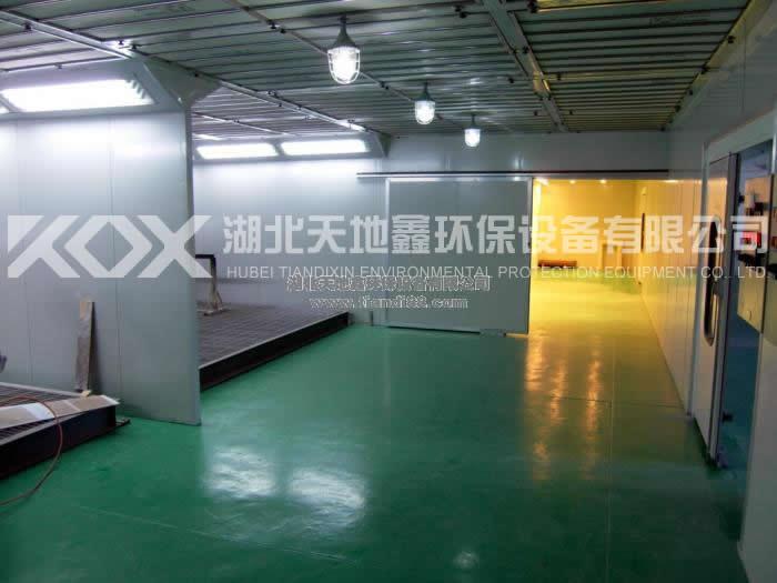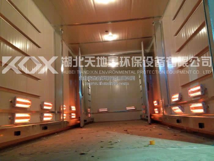 烤漆房(Spray booth)是一種給設備表面進行噴漆染色并烘干的設備,它不但能對設備起到美觀的作用,而且還能保護物品;既可以防止物體在潮濕和灰塵的惡劣環境中遭到腐蝕,噴漆可以防止金屬件被侵蝕,延緩塑料件的老化;同時可以通過噴漆上色對物體達到藝術化審美的設計風格,讓物體外型更美觀,帶來更多的商業價值和視覺美感??酒岱烤褪沁@種專業的設施通過技術處理對物體表面進行裝飾、修復的重要設備。簡言之,烤漆房一般是用來噴涂和烘烤漆的,因此,烤漆房最確切的描述應為“噴烤漆房”。它廣泛用于汽車、機械、五金、家具、玻璃鋼制品、化工設備等行業的工件表面噴漆、烤漆施工作業。(遠紅外加熱方式為家具烤漆中最為常用經濟的加熱方式) 半過濾吊頂相對全國旅吊頂經濟實惠,后期更換過濾棉成本大大降低,一半烤漆房面積比較大會選用此種結構??酒嵝Чc全過濾吊頂無異。噴漆時,外部空氣經過初級過濾網過濾后由風機送到房頂,再經過頂部過濾網二次過濾凈化后進入房內。房內空氣采用全降式,以0.2-0.3m/s的速度向下流動,使噴漆后的漆霧微粒不能在空氣中停留,而直接通過底部出風口被排出房外。這樣不斷地循環轉換,使噴漆時房內空氣清潔度達98%以上,且送入的空氣具有一定的壓力,可在家具的四周形成一恒定的氣流以去除過量的油漆,從而最大限度地保證噴漆的質量。烤漆時,將開關調至烤漆位置,烤房內溫度迅速升高到預定干燥溫度(30℃—60℃)。然后對家具進行烤漆,最后當烤漆時間達到設定的時間時,烤漆房自動關機,烤漆結束。