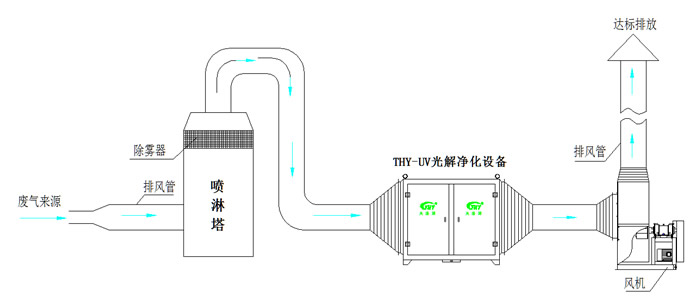 印刷廢氣處理需要考慮運營成本及安全性,本方案工藝路線擬采用以“通風系統(風機、收集罩、管道)+預處理系統(噴淋塔)+深度凈化系統(UV光解凈化設備)”為核心工藝來處理印刷廢氣,工藝設備圖如下: