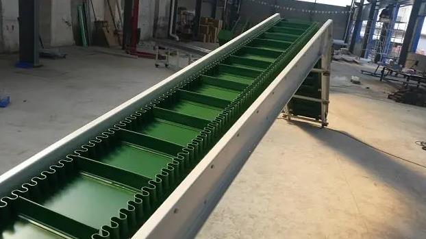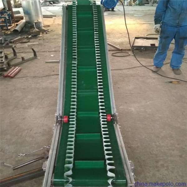 1、帶裙邊的輸送皮帶:裙邊皮帶輸送機(jī)的輸送帶的結(jié)構(gòu)形式為中間低的平面皮帶輔以兩邊高的類似裙邊的橡膠帶組合而成,這種設(shè)計(jì),能夠較好的防止物料灑落;其平面皮帶上,通常在一定的間距會(huì)有一定高度的橡膠擋板,這種結(jié)構(gòu)能夠很好的將物料輸送到較高位置。
